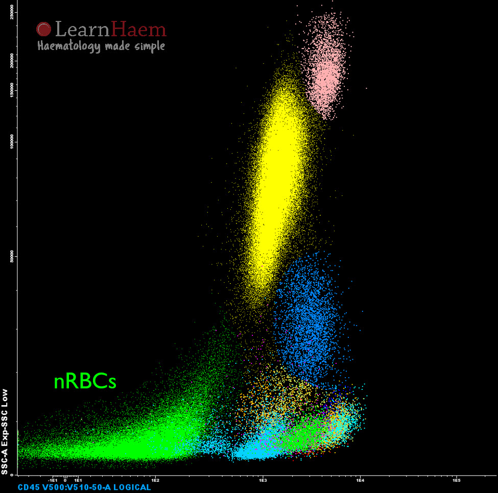 Erythroid cells are agranular with round nuclei and low cytoplasmic complexity. As such, they have a low side scatter. They are CD45 negative.