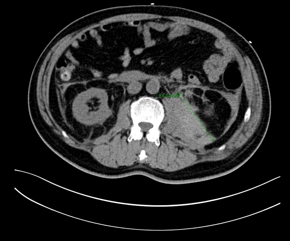 CT Aortogram showed no evidence of aortic dissection, but incidentally showed multiple pulmonary emboli and a large haematoma along the left psoas muscle, extending into the pelvis (7.5 x 8.0 x 16.1 cm). There were also filling defect noted in the inferior vena cava, left external iliac/femoral vein, suspicious of thrombosis.